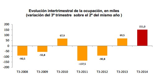 Entre julio y septiembre se crearon 151.000 empleos (+0,87%), el mayor incremento de la ocupación desde el tercer trimestre de 2007. En el último año, la ocupación ha aumentado en 274.000 personas, a un ritmo del 1,59%. Al finalizar septiembre, el número total de ocupados alcanzaba los 17.504.000, nivel que no se registraba desde el tercer trimestre de 2012.