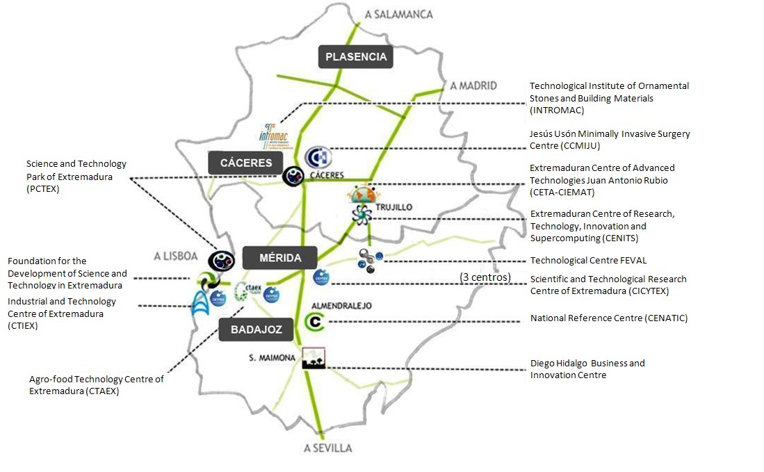 Como muestra el siguiente mapa, Extremadura apoya la innovación empresarial a través de su red de centros de I+D+i.