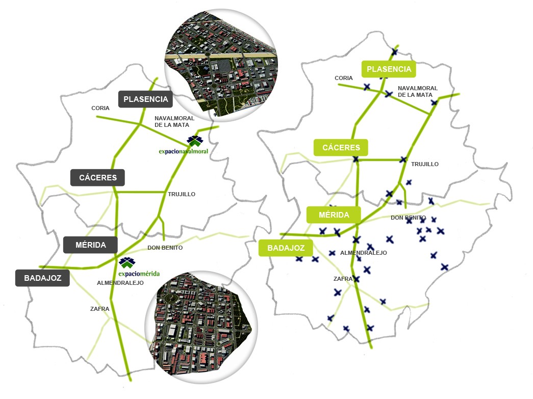 Así, los inversores podrán acceder a dos áreas empresariales con todas las dotaciones: el Expacio Mérida y el Expacio Navalmoral. Las empresas también podrán desempeñar su actividad en alguno de sus 39 polígonos industriales, con parcelas de 300 a 5.000 m2, o si lo prefieren, en 33 parques empresariales, con naves de unos 200 m2.