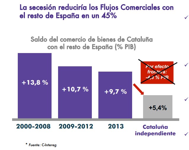 Según distintas experiencias históricas de secesión por efecto frontera, la independencia reduce las relaciones comerciales entre un 25% y un 70% entre las partes de un país que se fragmenta. Dicho efecto reduciría el saldo comercial positivo de Cataluña con el resto de España desde el actual + 9,7% del PIB hasta el + 5,4 %. Con el resto de la UE y del mundo, Cataluña tiene actualmente un déficit de - 4% del PIB, que se incrementaría hasta un - 7% del PIB.