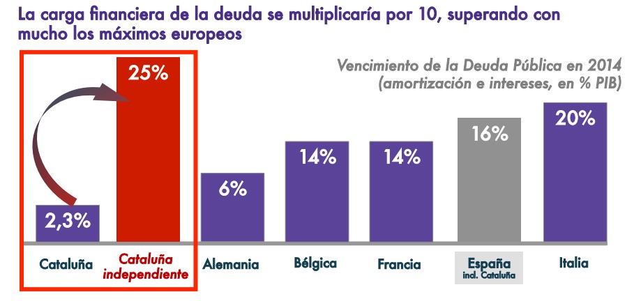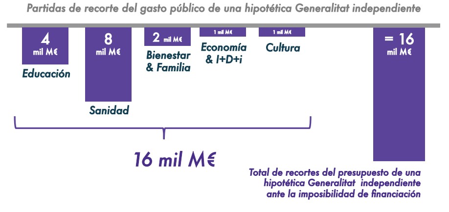 El déficit público aumentaría hasta el 10,3% del PIB y la deuda pública se cuadruplicaría hasta el 118% del PIB, lo que "situaría a Cataluña entre los países más endeudados", mientras que "el grave deterioro de las finanzas públicas obligaría a fuertes recortes del gasto público de la Generalidad en partidas claves", de 16.000 millones de euros.