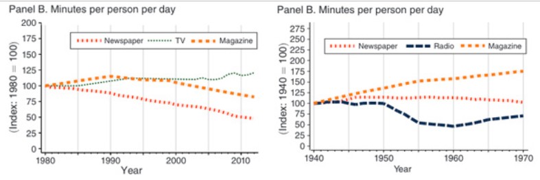 Desde las altas esferas de la prensa escrita se argumenta a menudo que la aparición de internet ha tenido un impacto devastador en el número de lectores que acuden a los quioscos para comprar cabeceras de diarios impresos. Sin embargo, el economista de la Universidad de Chicago Matthew Gentzkow mantiene que esa tendencia decreciente "venía desarrollándose desde décadas atrás".