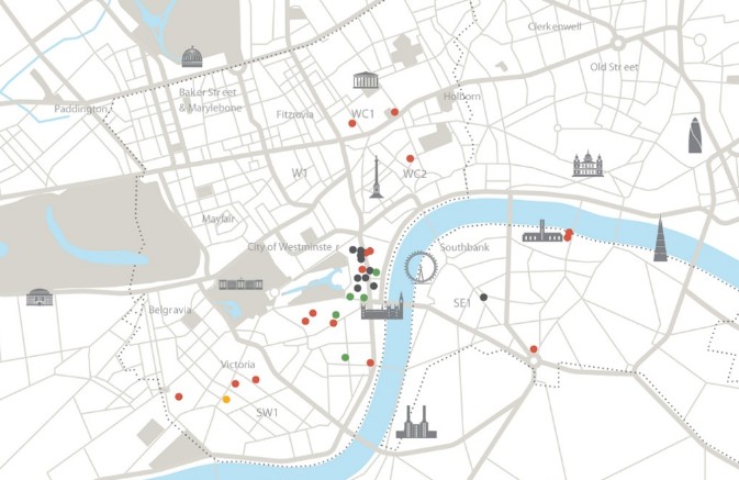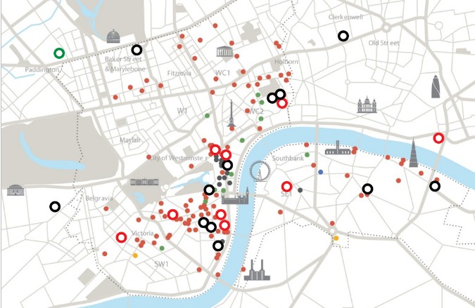 El siguiente mapa muestra todas las sedes del Gobierno británico que hoy están ubicadas en el centro de Londres: