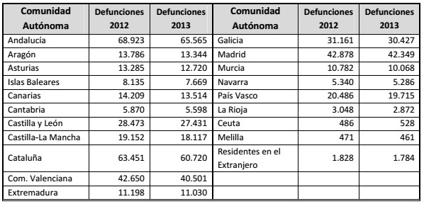 En 2012, los fallecimientos se incrementaron un 4,6% respecto a 2011, el mayor incremento anual de la década. Este aumento de las defunciones se ha producido de manera generalizada en todas las comunidades autónomas. Sin embargo, esta situación ha cambiado en 2013. Según datos del Instituto Nacional de Estadística, el año pasado murieron en España 389.699 personas, 190.211 mujeres y 199.488 varones. El dato supone un descenso de 15.916 fallecidos respecto al año 2012, o lo que es lo mismo, un 3,3% menos que en el año anterior.