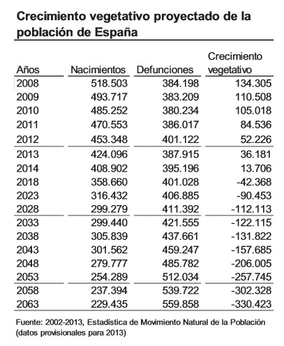 El dato relevante a este respecto es que, a partir de 2015, se producirán en España más muertes que nacimientos, lo cual "ya sucede desde hace varios años con los españoles autóctonos", aunque hasta ahora "se había podido compensar porque los inmigrantes aportan un número apreciable de nacimientos, pero relativamente pocos fallecimientos, al ser en promedio más jóvenes que el conjunto de los españoles".