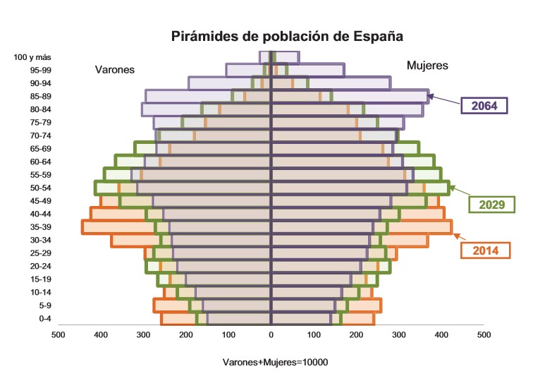 Dentro de 50 años, España sumará 7,4 millones extra de personas con 65 años o más (incremento del 87%), que pasarán de ser el 18% de la población en 2014 al 39% en 2064. Al mismo tiempo, el país perderá 13 millones de personas con menos de 65 años (descenso del 34%) desde 2014 a 2064. Ahora, el 6% de la población de España tiene 80 años o más (eran sólo el 2% en 1976), pero en 2064 será el 21%. Los nonagenarios y centenarios, que ahora representan el 0,9% de la población, representarán el 8,4% del total en 2064.