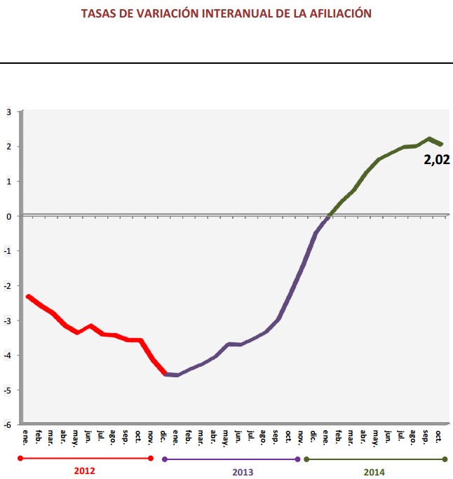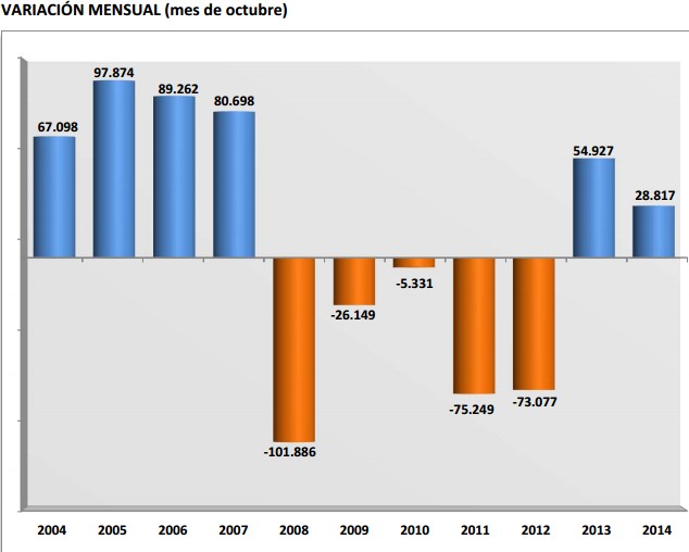 Los datos, en este caso, son positivos, ya que el paro bajó en 19.393 personas, el mejor dato en un mes de octubre desde 1998, mientras que la afiliación sumó 5.209 cotizantes por segundo año consecutivo, aunque se trata de una cifra muy inferior a la registrada en octubre de 2013 (+31.712).