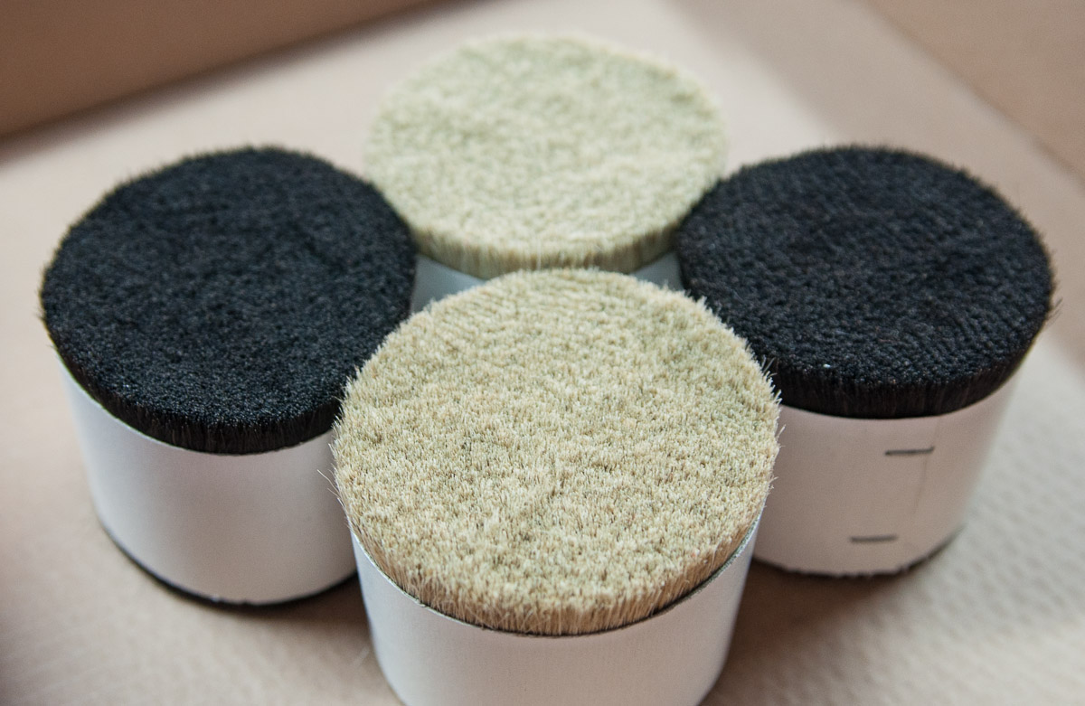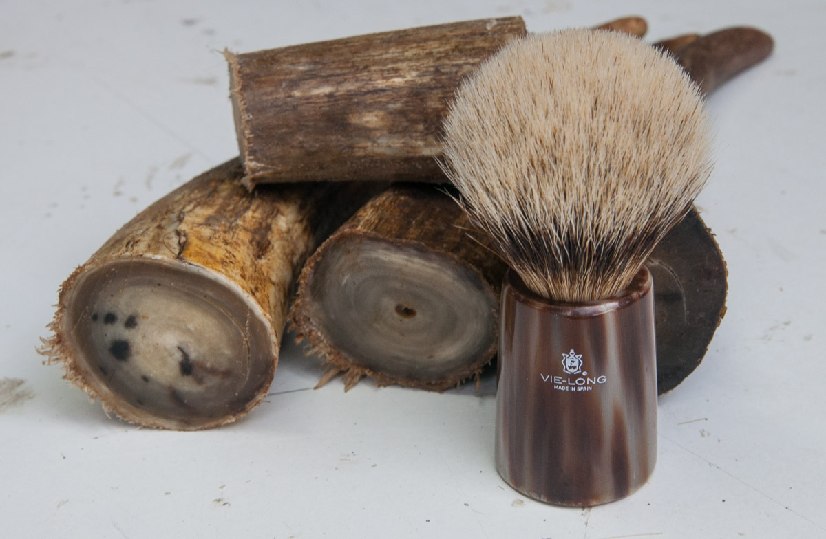 Por otro lado nos llega el pelo. Vie-long es el único fabricante importante de brochas de afeitar del mundo que utiliza pelo de caballo -además de los más habituales de tejón y de cerda-. El pelo proviene de diferentes animales, tejón, caballo y cerdo, y para la fabricación de algunas brochas es mezclado. Previamente se ha lavado y hervido para esterilizarlo. Después de este tratamiento es cortado y juntado para presentar un aspecto como el que vemos en la imagen