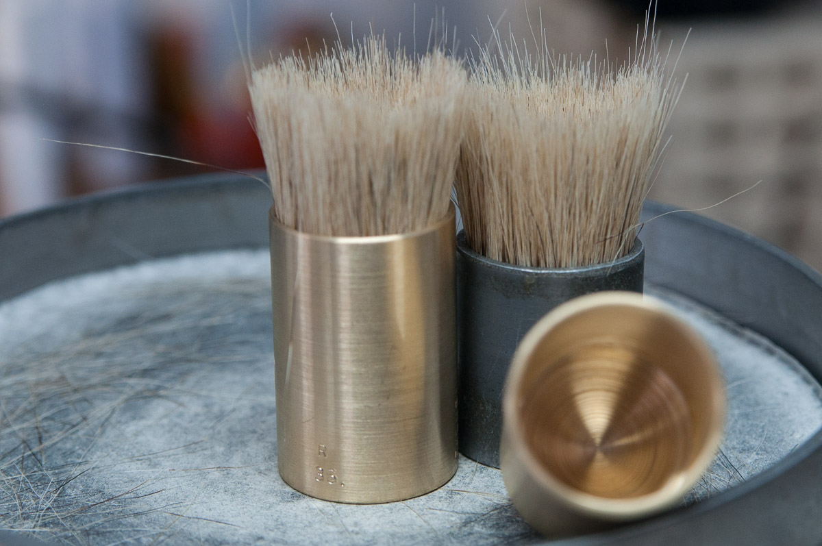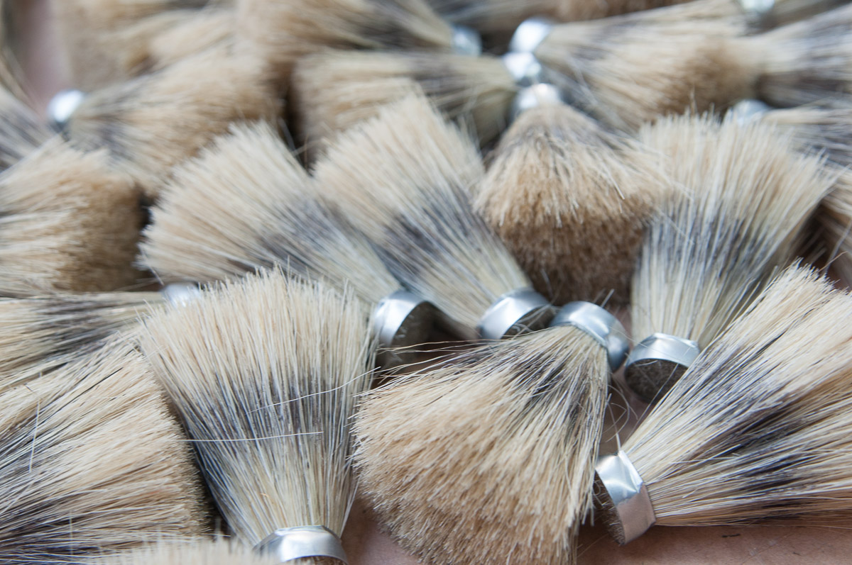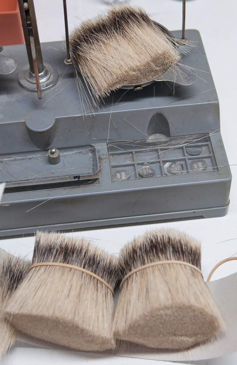 Para las brochas de tejón el proceso es diferente en muchos puntos, para empezar en el que el pelo no se puede tratar a máquina -es más delicado- sino que incluso se pesa manualmente brocha a brocha