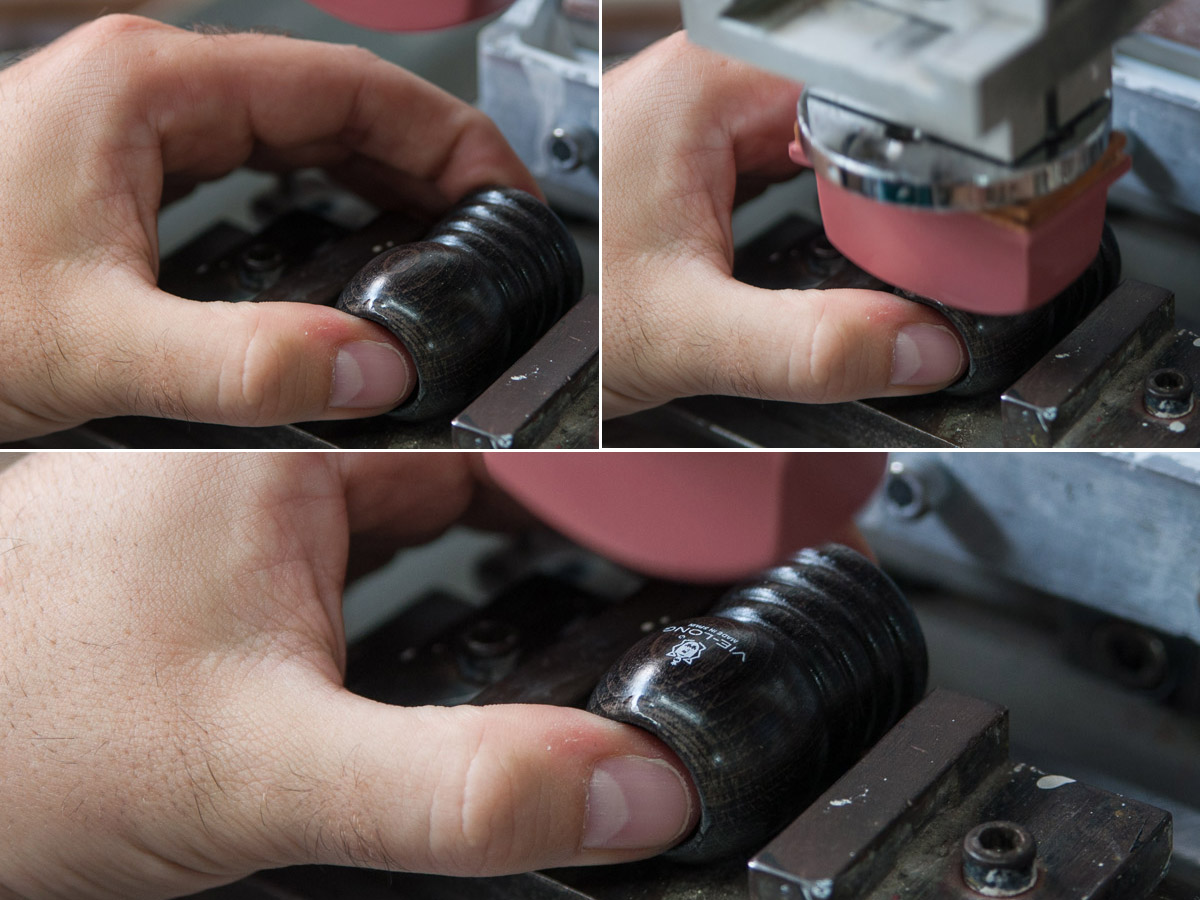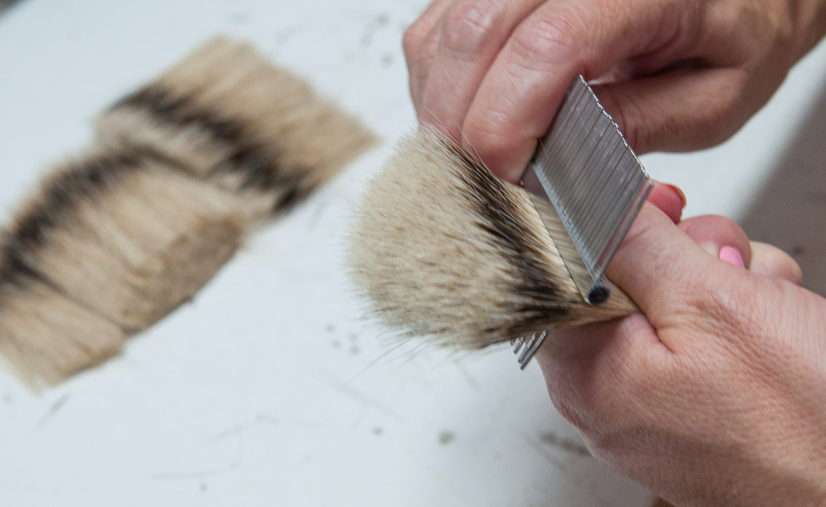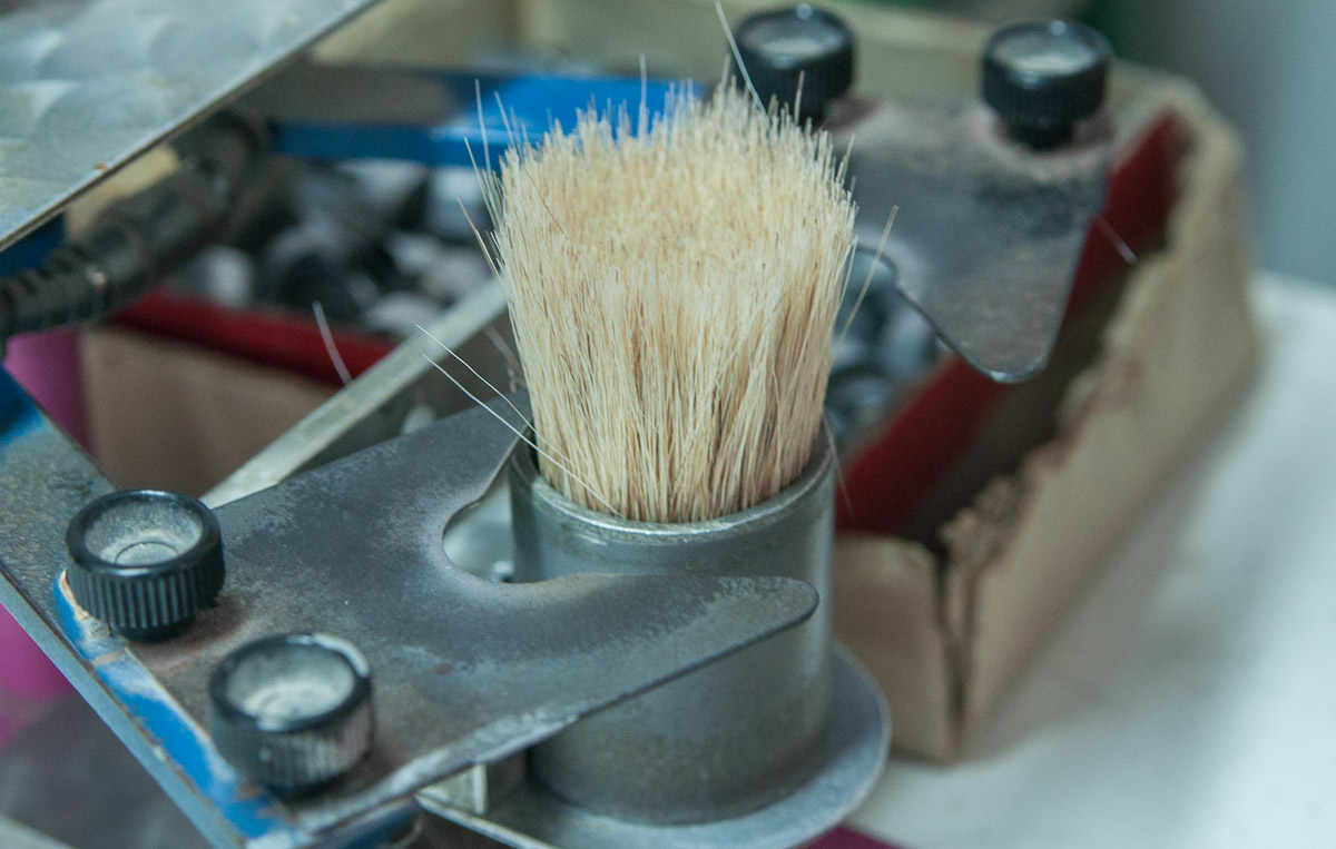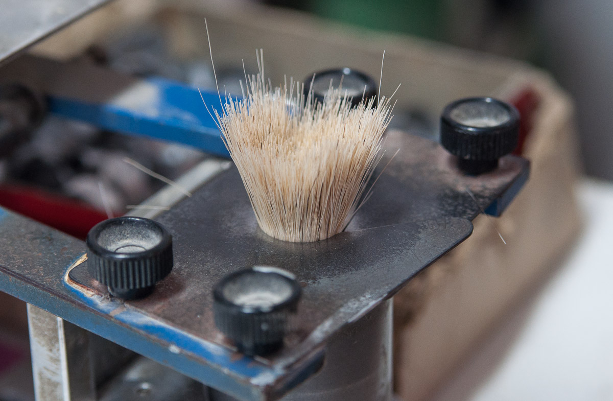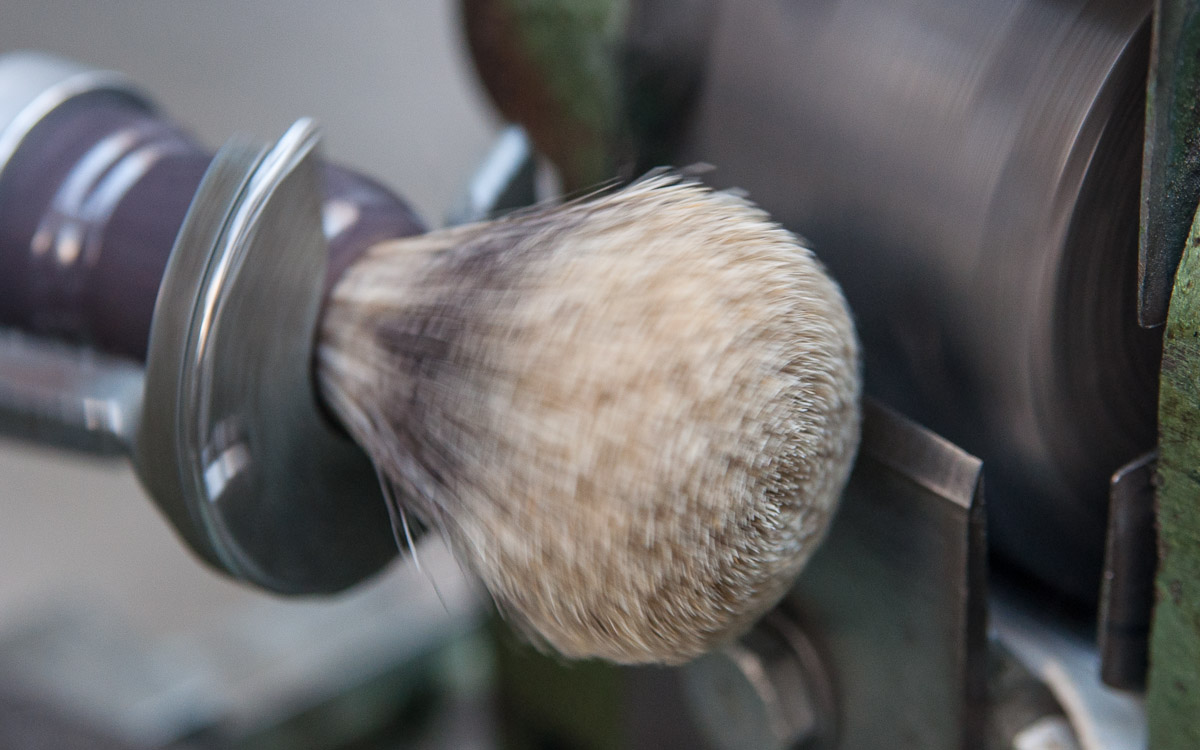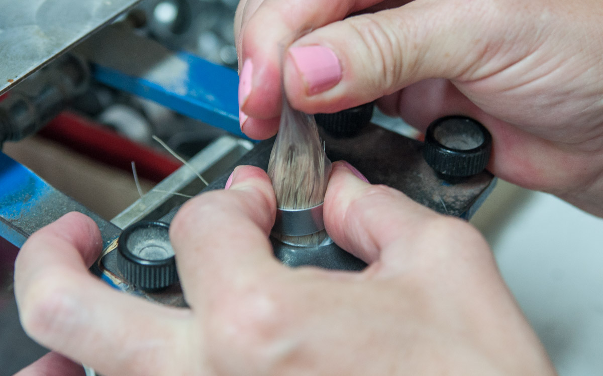 Todavía hay que dar forma al nudo para que sea más cómodo a la hora de enjabonarse el rostro antes del afeitado, se hace con una máquina en la que los pelos se "tornean"