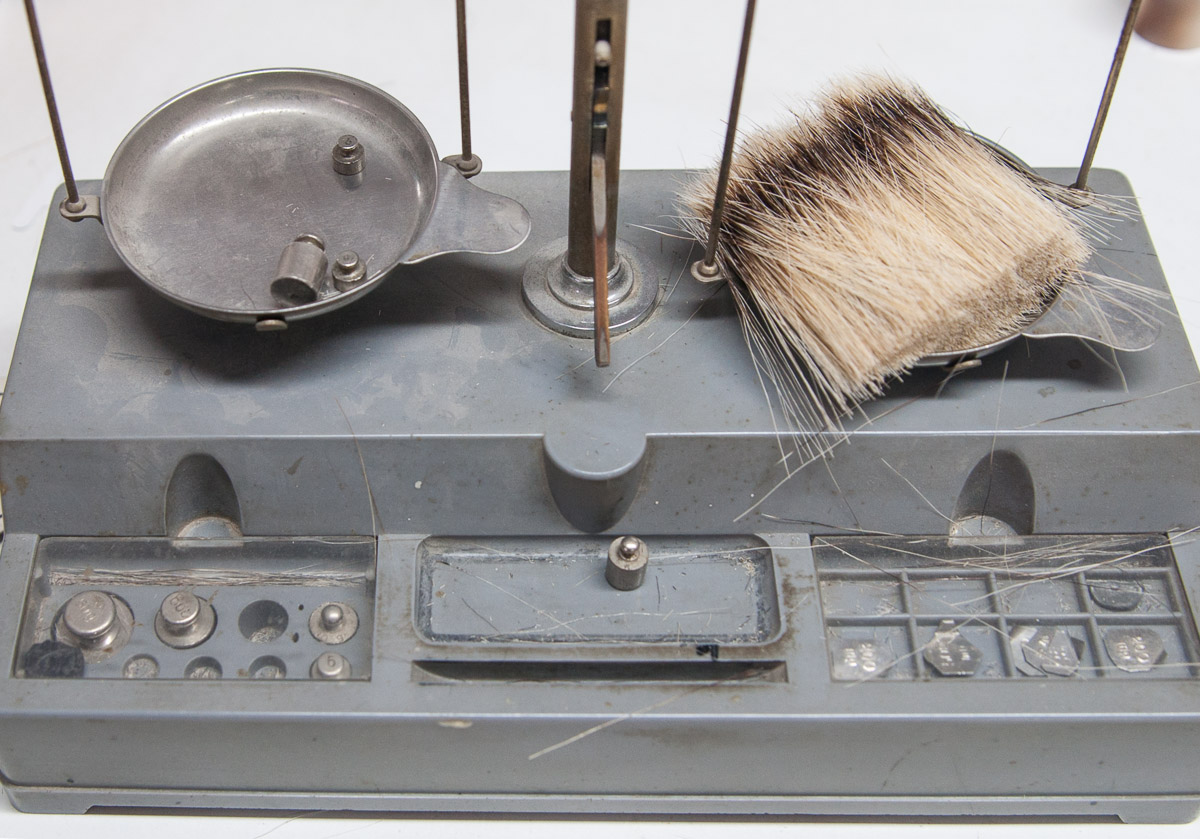 Una vieja pero precisa balanza es la encargada de pesar el pelo que llevará cada brocha de Vie-Long, el peso cambiará según los modelos ya que en algunos el nudo es de mayor tamaño y, por tanto, son necesarios más pelos