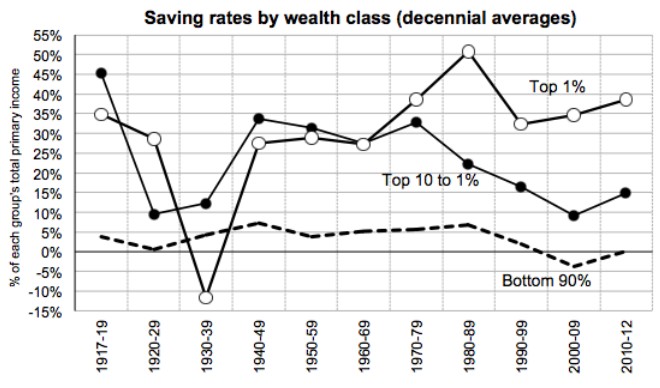 A esta conclusión han llegado Emmanuel Saez y Gabriel Zucman, investigadores cercanos a Thomas Piketty que han actualizado las estimaciones disponibles sobre las dinámicas de la desigualdad de ingresos. Según ambos profesores, "excluyendo al 10% más acaudalado, y centrándonos en el 90% de la población, encontramos que, tradicionalmente, la ratio de ahorro estaba en niveles del 6%".