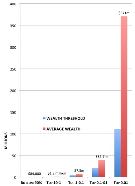 La riqueza media de quienes figuran entre el 10% y el 1% más rico es de 1,3 millones de dólares, mientras que el 1% que registra un mayor patrimonio se mueve entre los 7,3 y los 371 millones de dólares, dependiendo del tramo analizado. De hecho, las diferencias dentro de ese 1% son tan significativas que ambos autores se esfuerzan en separar también al 0,1% más acaudalado del 0,9% restante.