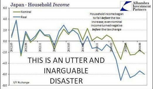 Abe se escuda en que dicho aumento es el principal causante de la contracción económica, y no sus estímulos. Sin embargo, tal y como recuerda el economista Juan Ramón Rallo, la caída de la actividad comenzó antes de que se aplicara la citada subida del IVA -el ingreso medio de los hogares empezó a descender antes de aumentar impuestos-.