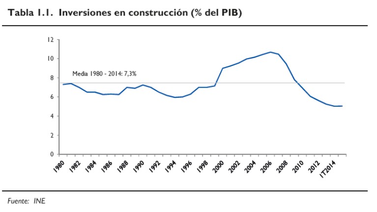 Si trazamos la media del periodo 1980-2014, vemos que la inversión en el sector se sitúa en el 7,3% del PIB. Sin embargo, en el pico previo a la crisis se llegó a registrar un nivel del 11%, con cifras puntuales que incluso acercaban este indicador hasta el 12%.