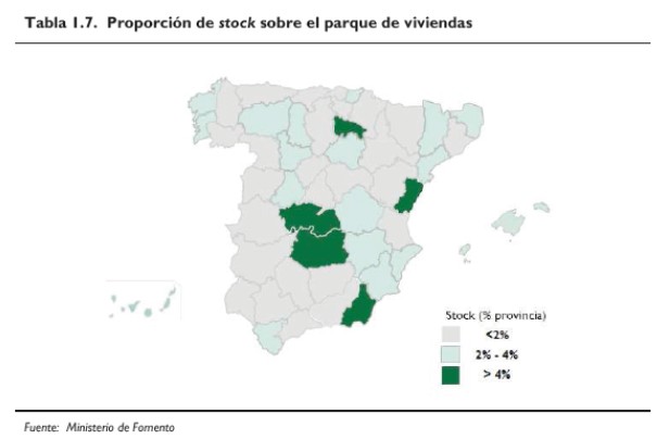 El informe de Arcano apunta que, si bien los datos agregados aún muestran un elevado stock de viviendas, lo cierto es que un vistazo más cuidado a las cifras del Ministerio de Fomento nos permite identificar la irregular distribución territorial de los inmuebles. Así, cuando expresamos la proporción de stock sobre el parque de viviendas, encontramos que solamente cinco provincias españolas superan la ratio del 4%.