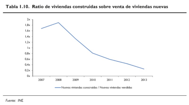 Por otro lado, la ratio de viviendas construidas sobre la venta de viviendas nuevas también confirma que el ajuste está siendo intenso. Conforme ambos indicadores se van acoplando, nos acercamos más y más al fin del difícil proceso de depuración de excesos iniciado tras el pinchazo de la burbuja.