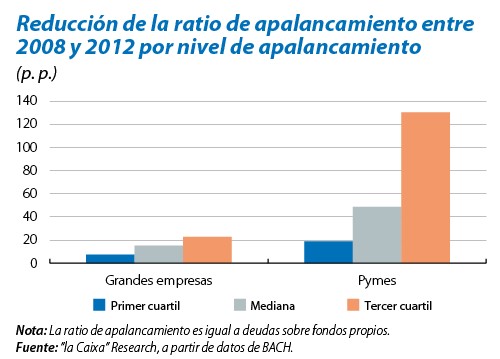 Según la evolución de la ratio de apalancamiento (deuda sobre fondos propios) entre el año 2008 y el 2012, las pymes han reducido considerablemente su endeudamiento, en 49 puntos porcentuales para la empresa del segundo cuartil, pero el ajuste de las empresas grandes fue mucho menor (15 puntos).