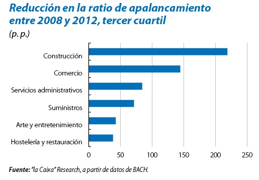 En contraste, las empresas grandes, incluyendo las más apalancadas del tercer cuartil, apenas se desapalancaron entre 2008 y 2012. "Este patrón muestra que, por el momento, las pymes, cuya actividad económica y sus fuentes de financiación externa están en general poco diversificadas, han llevado a cabo la mayor parte del ajuste", añaden los analistas.