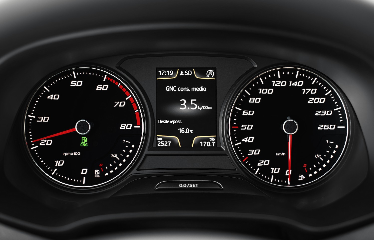 El conductor tiene en el salpicadero la información sobre el estado del combustible de CNG (a la izquierda) y de la gasolina (a la derecha).