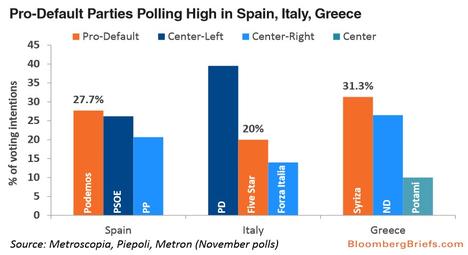 Por último, los analistas de Bloomberg señalan que, en un entorno económico deprimido como el actual y elevadas tasas de paro, el creciente apoyo electoral que están cosechando los populistas en Grecia, España e Italia podría acabar tentando a los partidos tradicionales a adoptar alguno de sus grandes emblemas, como, por ejemplo, el impago de la deuda soberana, desatando con ello una nueva crisis financiera. No en vano, estos tres estados acumulan una deuda pública próxima a 3,5 billones de euros.
