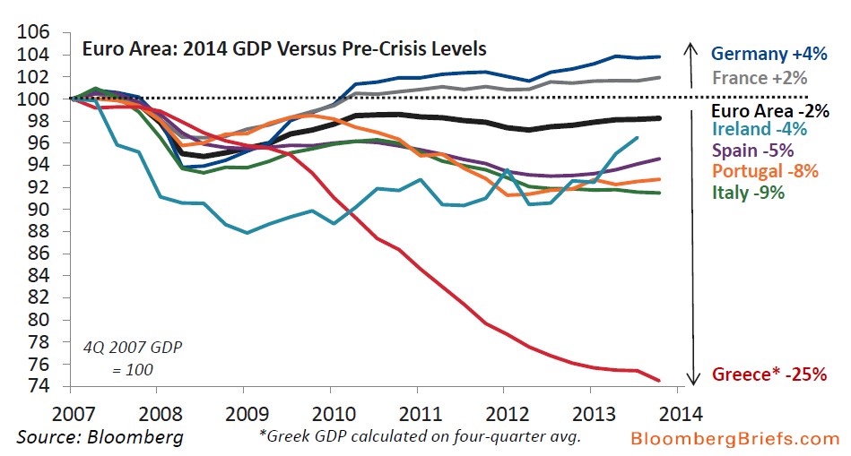 La deuda del Estado español roza el 100% del PIB, la de Italia supera el 130% y la de Grecia el 175%; sus tasas de paro son las más elevadas de Europa: 26% en el caso de Grecia, 24% en España y 12,6% en Italia; además, tras siete años de crisis, ninguno de los tres ha logrado superar sus problemas económicos: el PIB de Grecia es hoy un 25% inferior al nivel registrado antes del estallido de la crisis, un 9% menos en el caso de Italia y un 5% inferior en España.