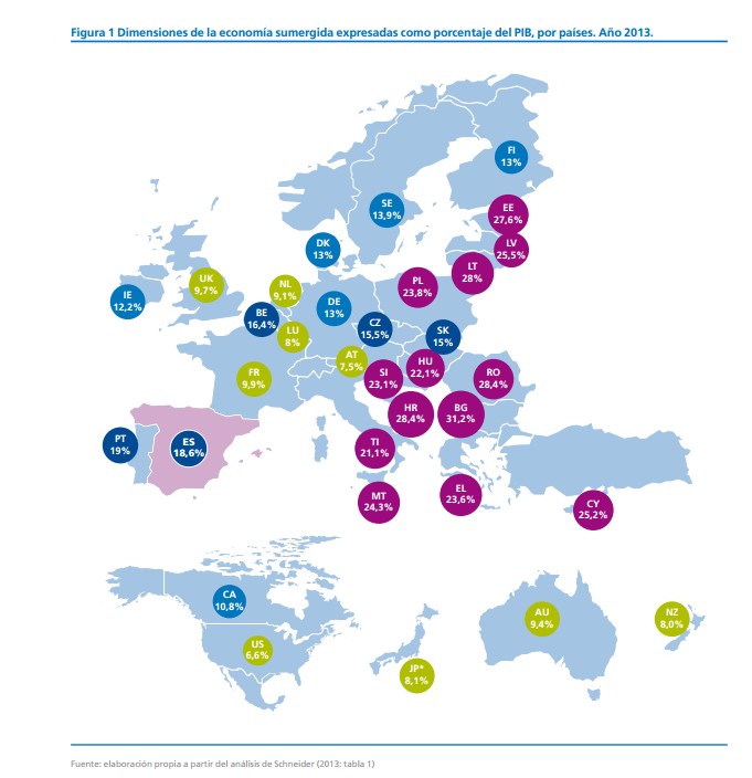 En el caso español, una de las principales conclusiones es que el empleo no declarado representa un 18,6% de Producto Interior Bruto (PIB), lo que duplica las tasas de otros países del entorno como Francia o Reino Unido, ambas por debajo del 10%.