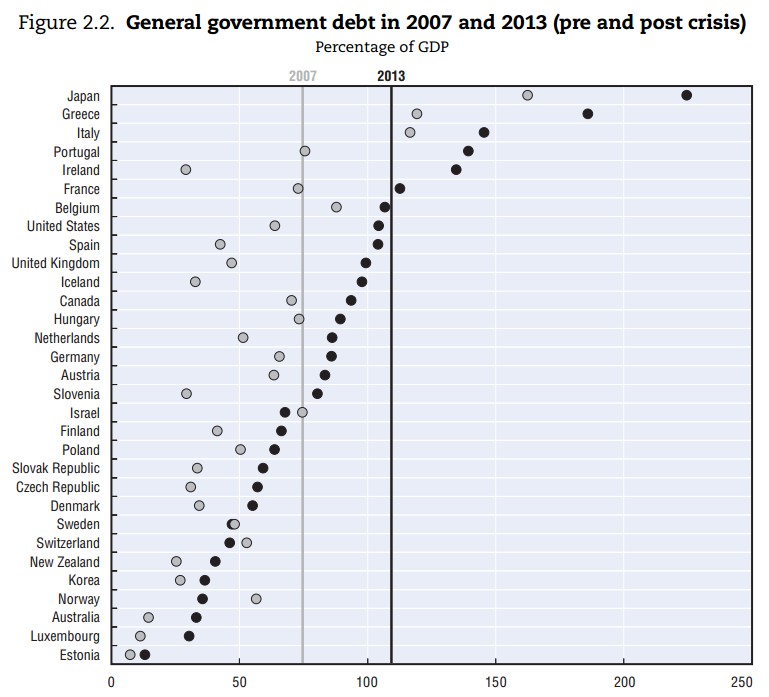 Los jubilados de estos países tienen un doble motivo de preocupación. No es sólo que sus gobiernos dediquen una mayor parte de su presupuesto al pago de sus pensiones, es que además sus finanzas públicas están al límite de su sostenibilidad. Lo estaban antes de la crisis y no han mejorado precisamente tras ésta. El siguiente gráfico es muy significativo: