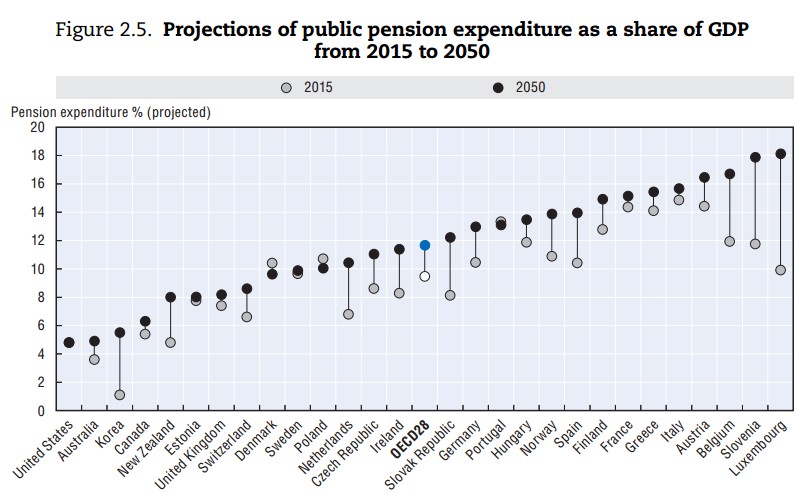Todos los sistemas públicos de pensiones, como puede verse en el siguiente gráfico, dispararán su peso en el gasto público en las próximas décadas. Por eso, cuanto más se haga por el lado de los ingresos, menos dolorosos y más paulatinos, serán los ajustes.