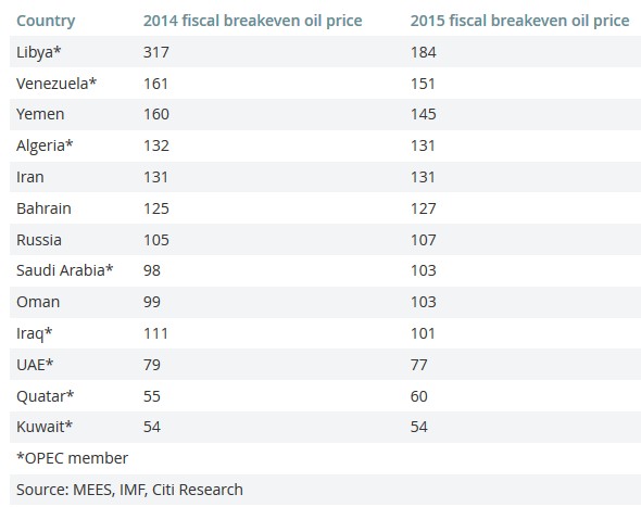 Según las estimaciones realizadas por Citi, Venezuela necesita que el barril cotice por encima de 150 dólares en 2015 para poder equilibrar sus presupuestos, tan sólo superado por Libia, cuyo umbral de equilibrio fiscal supera los 180 dólares.