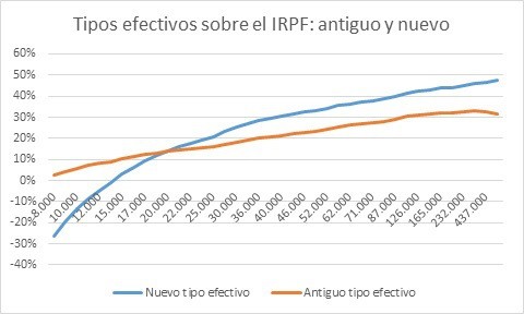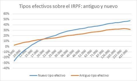 (Omito del gráfico los tipos efectivos negativos de las rentas inferiores a 7.500 euros, ya que de incluirlos el gráfico sería difícilmente visualizable por la escala)