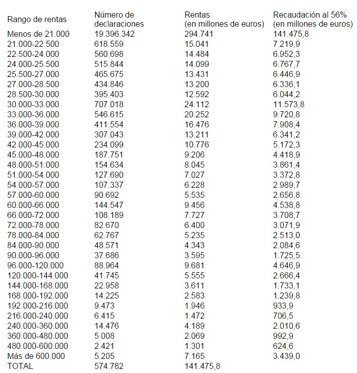 Pues bien, ¿qué tipo impositivo único deberíamos establecer en el IRPF para recaudar 277.000 millones de euros sobre las rentas brutas de 574.781 millones? El 48%.