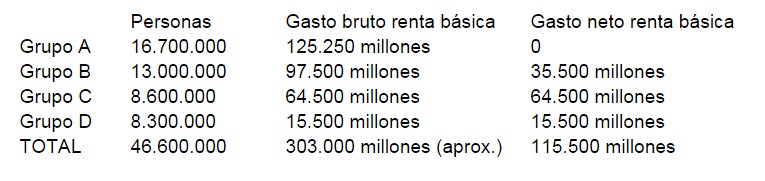 Por tanto, en principio la renta básica debería implicar un incremento del gasto público de 115.500 millones (el grupo A no cobra nada; el grupo B se resarce cobrando 35.500 millones). Pero ya hemos dicho que la renta básica llevaría asociada una eliminación de programas de gasto público de 93.000 millones, de modo que con un aumento neto del gasto público de 22.500 millones podría financiarse el programa anterior.