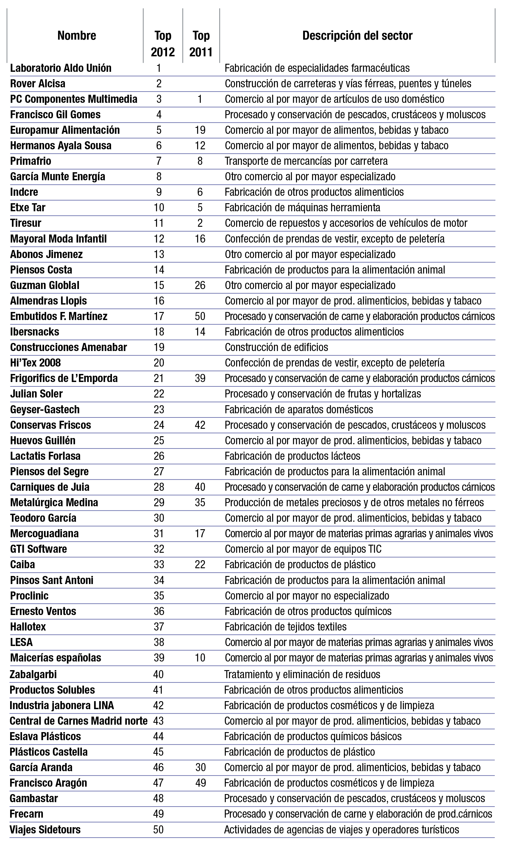 Un dato destacable de esta lista es que las empresas del Top 50 han conseguido un incremento del 30% de las ventas acumulado durante el periodo 2008-2012, frente al retroceso del 9% correspondiente a todo el conjunto de empresas medianas. Este incremento, en un contexto de destrucción de empleo, se ha traducido en ganancias de productividad. De hecho, las empresas del Top 50 cuentan con una ratio media de ventas por empleado superior al millón de euros, muy por encima de los 242.000 euros por empleado que corresponde al resto de empresas medianas.