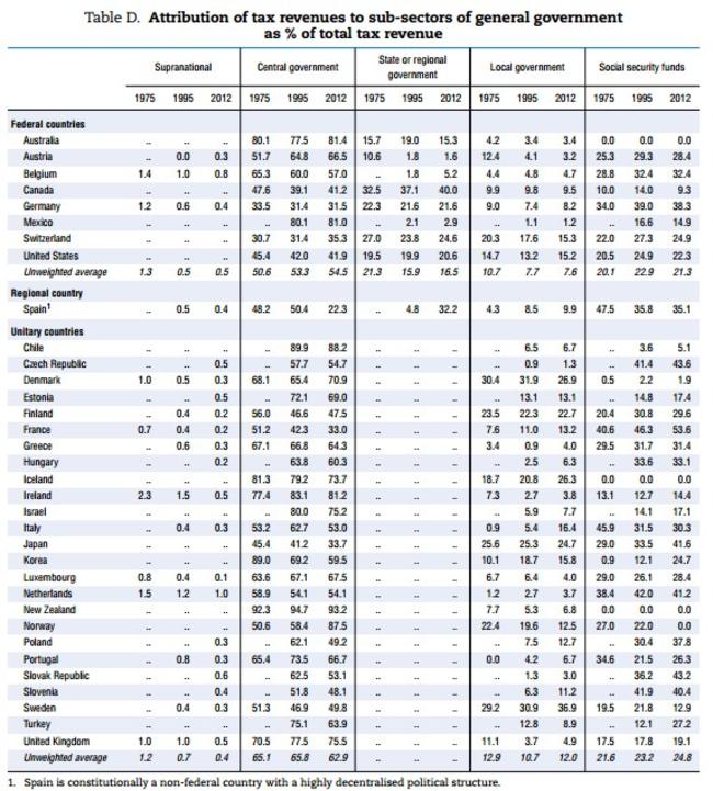 Pero además, en las estadísticas de la OCDE hay otras cifras destacadas. Por ejemplo, en lo que hace referencia al reparto de los ingresos públicos por tipo de gobierno. La publicación distingue entre tres tipos de países: federales, regionales y unitarios. Y España ocupa, en solitario, el segundo de los grupos. No hay ningún otro país "regional" en la tabla.