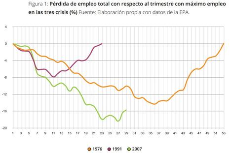 Como puede verse, la de 1991, a pesar de lo dura que pareció en su momento, fue la más corta. Eso sí, tardamos 23 trimestres (casi seis años) en volver a los niveles de empleo anteriores a la crisis. Es una cifra muy alta, pero palidece ante los 53 trimestres (13 años) que necesitó nuestro país para recuperarse en la crisis de los años 70.
