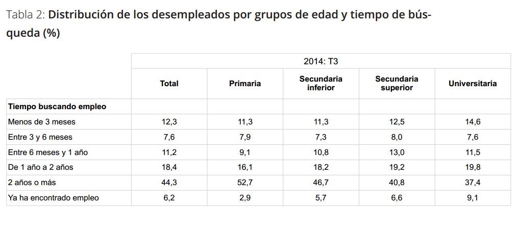 En este sentido, el siguiente cuadro puede servir para explicar el drama al que la duración de la crisis ha empujado a cientos de miles de trabajadores españoles. Muestras los datos de los desempleados (EPA del tercer trimestre) en función de su tiempo de búsqueda de empleo. Como puede verse, el 62,7% de los parados españoles son de larga duración (llevan más de un año sin trabajar). De hecho, casi la mitad (44,3% de los parados) acumula ya 24 meses sin un trabajo.
