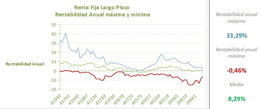 Sigue la buena rentabilidad anual de los planes de pensiones de renta Fija a Largo, con una media anual de 8,29%, algo más alta que la del mes anterior (7,88%) y por encima de la que registraba hace un año (6,33%). La rentabilidad máxima anual es de 33,29%, algo superior al mes pasado, mientras que la mínima se mantiene estable en el -0,46%.