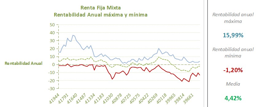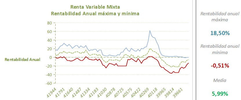 Subida en el rango de rentabilidades máxima y mínima de los fondos de renta variable mixta. Asciende, desde el 16,20% hasta el 18,50% el máximo de rentabilidad. El mínimo persiste en negativo aunque mejora, con un -0,51%. La diferencia entre la mejor y menor rentabilidad es de 19,01%.