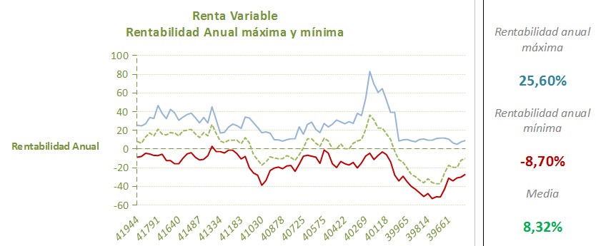 Las rentabilidades anuales se mantienen similares al mes de octubre. La máxima en 15,99% y la mínima en -1,20%, una diferencia porcentual entre una y otra de 17,19 puntos. La rentabilidad media anual es de 4,42%, alejada del 7% de hace un año.