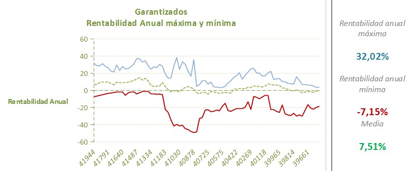Mejoría también en el rango de rentabilidades máxima de los planes garantizados, con una subida desde el 29,07% al 32,02%. La mínima continúa bajando y manteniéndose en negativo con un -7,15%. La diferencia entre la mejor y la peor rentabilidad anual es de 39,17 puntos porcentuales.