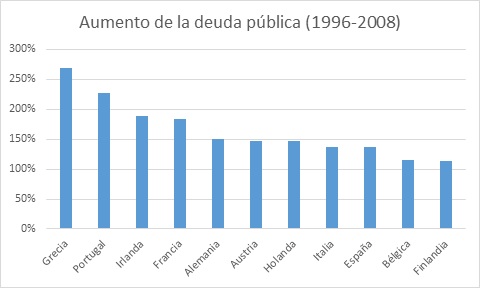 Grecia entró en bancarrota no porque pagara intereses usurarios por su deuda, sino porque se hiperendeudó para que sus políticos pudieran gastar a manos llenas: mientras que Alemania mantuvo constante en términos reales su gasto público por habitante entre 1996 y 2008, Grecia lo aumentó en un 80%. La hipertrofia del Estado griego durante los años de la burbuja tiene escaso parangón en Europa, especialmente si atendemos a cómo se financió: Grecia no sólo fue uno de los países que más incrementó su gasto público, sino el que más recurrió con mayor obsesión a la deuda pública para financiarlo (España también fue de los que más aumentaron su gasto público pero lo financió con cargo a los ingresos tributarios insostenibles fruto de la burbuja de endeudamiento privado).
