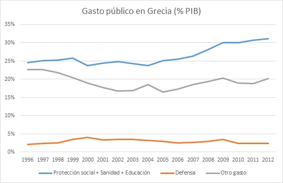 Pese a que nadie ha explicado por qué Alemania puede lucrarse más vendiendo fragatas al Ministerio de Defensa griego que vendiendo medicamentos de Bayer al Ministerio de Sanidad griego o software de SAP al Ministerio de Educación griego, conviene en cualquier caso echarle un vistazo a los datos. Si lo hacemos, descubriremos que, en 2012, el gasto en Defensa del Gobierno griego representaba el 2,4% del PIB, un porcentaje prácticamente calcado al de 1996. En cambio, el gasto en educación, sanidad y política social se había disparado desde el 24,6% del PIB al 31,1%: así pues, no sólo el grueso del gasto público griego se concentraba en gasto "social" (éste es ahora mismo trece veces superior al gasto militar), sino que esa partida también es la que más rápidamente ha aumentado en términos relativos desde 1996. Remarco lo de "en términos relativos": desde 2009, que el gasto social suba en términos de PIB no significa que lo haga en términos absolutos, ya que el PIB griego se ha hundido desde entonces; lo que sí significa es que la partida que menos se ha reducido proporcionalmente ha sido la que más había crecido hasta 2009: el gasto social.