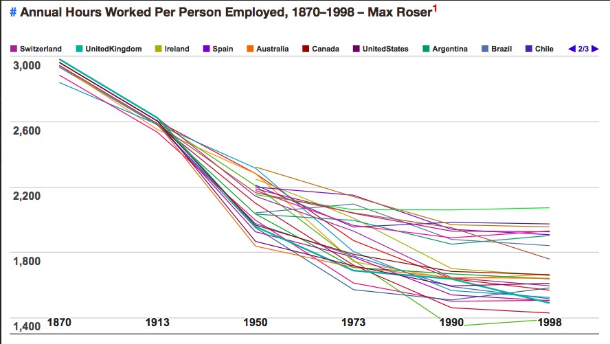 Otro aspecto positivo que también cabe destacar cuando analizamos la evolución de la economía en los últimos doscientos años es la tendencia a la baja del número de horas trabajadas. Lo vemos en la siguiente gráfica, que combina datos de países desarrollados (la línea azul es para España) con cifras de naciones emergentes.