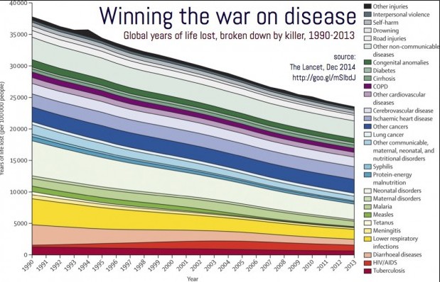En este sentido, cabe subrayar que la proporción de personas que sufren la lacra de la malnutrición ha bajado del 23,6% al 11,8% entre 1990 y 2015, de acuerdo con los datos de la ONU. También, como vemos en la siguiente gráfica, el número de muertes por enfermedad ha bajado sustancialmente entre 1990 y 2013, con independencia de que algunas dolencias tengan mayor o menor prevalencia.