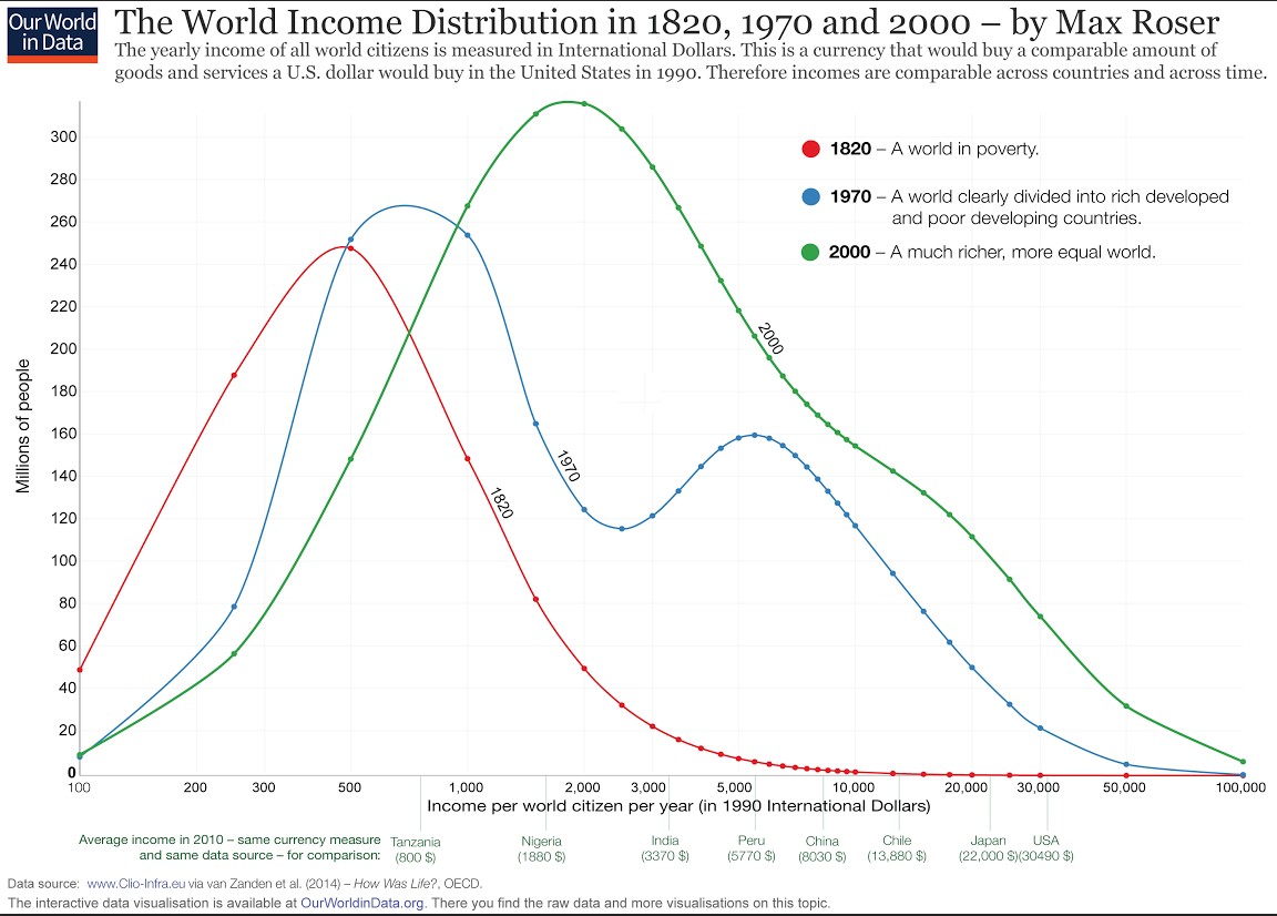 Así, la línea roja muestra que, a comienzos del siglo XIX, la pobreza era generalizada, lo que implicaba tasas de igualdad altas. A mediados del siglo XX (línea azul), la cosa había cambiado: había más países fuera de la pobreza, por lo que la desigualdad había aumentado.