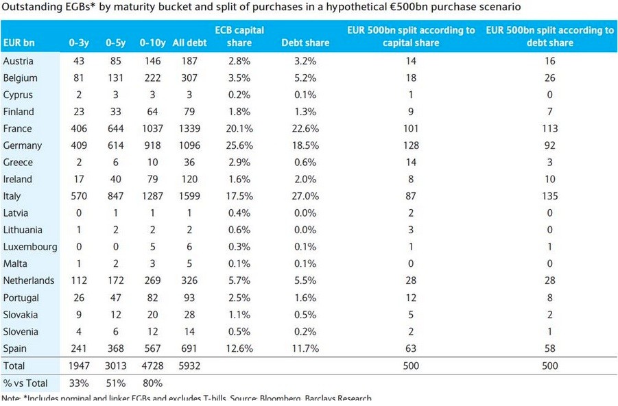 Así pues, tal y como refleja el siguiente gráfico, la entidad destinaría el 26% del programa a la compra de bonos alemanes (128.000 millones de euros), el 12% a deuda española (63.000 millones), y así sucesivamente, siempre y cuando la cuantía total del plan ascienda a medio billón de euros.