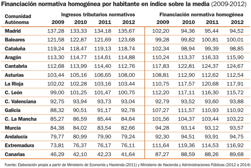 Su análisis no se queda aquí. El informe tiene varias tablas detallando cómo estaban las CCAA con el modelo de 2001, con qué datos se inició el del 2009 y cómo han quedado desde que se inició su aplicación. Los autores creen que "el sistema no es equitativo horizontalmente", ya que genera importantes diferencias de financiación por habitante entre regiones. Por ejemplo, en la siguiente tabla, que muestra la capacidad de recaudación de cada región y su financiación, se muestra cómo Madrid, por ejemplo, siendo la que más aporta por habitante (135,67 siendo 100 la media nacional) es luego la tercera que menos recibe (94,52 respecto a 100).