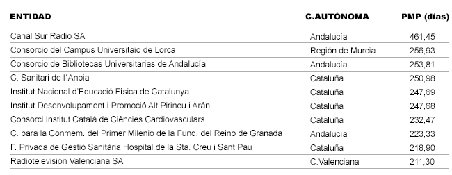En las empresas públicas dependientes de las autonomías es donde se encuentra el problema más serio. Hay instituciones que llegan a pagar sus deudas comerciales con más de un año de retraso. El pasado mes de octubre, la emisora andaluza Canal Sur Radio se convirtió en la más morosa de España con un periodo medio de pago de 461 días. A Canal Sur Radio le sigue El Consorcio del Campus Universitario de Lorca, de Murcia, y el de Bibliotecas Universitarias de Andalucía, que pagan a 256 y 253 días respectivamente.