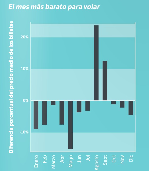 El documento explica que, independientemente de la ruta elegida, existe un patrón claro sobre cuándo es más barato viajar. En España, el mes más económico para comprar un billete de avión es mayo. En el quinto mes del año es posible ahorrarse un 15,5% sobre el precio medio de los billetes. Por el contrario, el mes con los vuelos más caros del año es agosto, fecha en la que la mayoría de los españoles se cogen las vacaciones y la demanda se dispara.